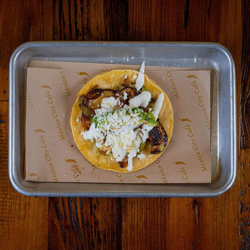 Mix of fajita veggies on corn tortillas. Topped with queso fresco, sour cream, and avocado.